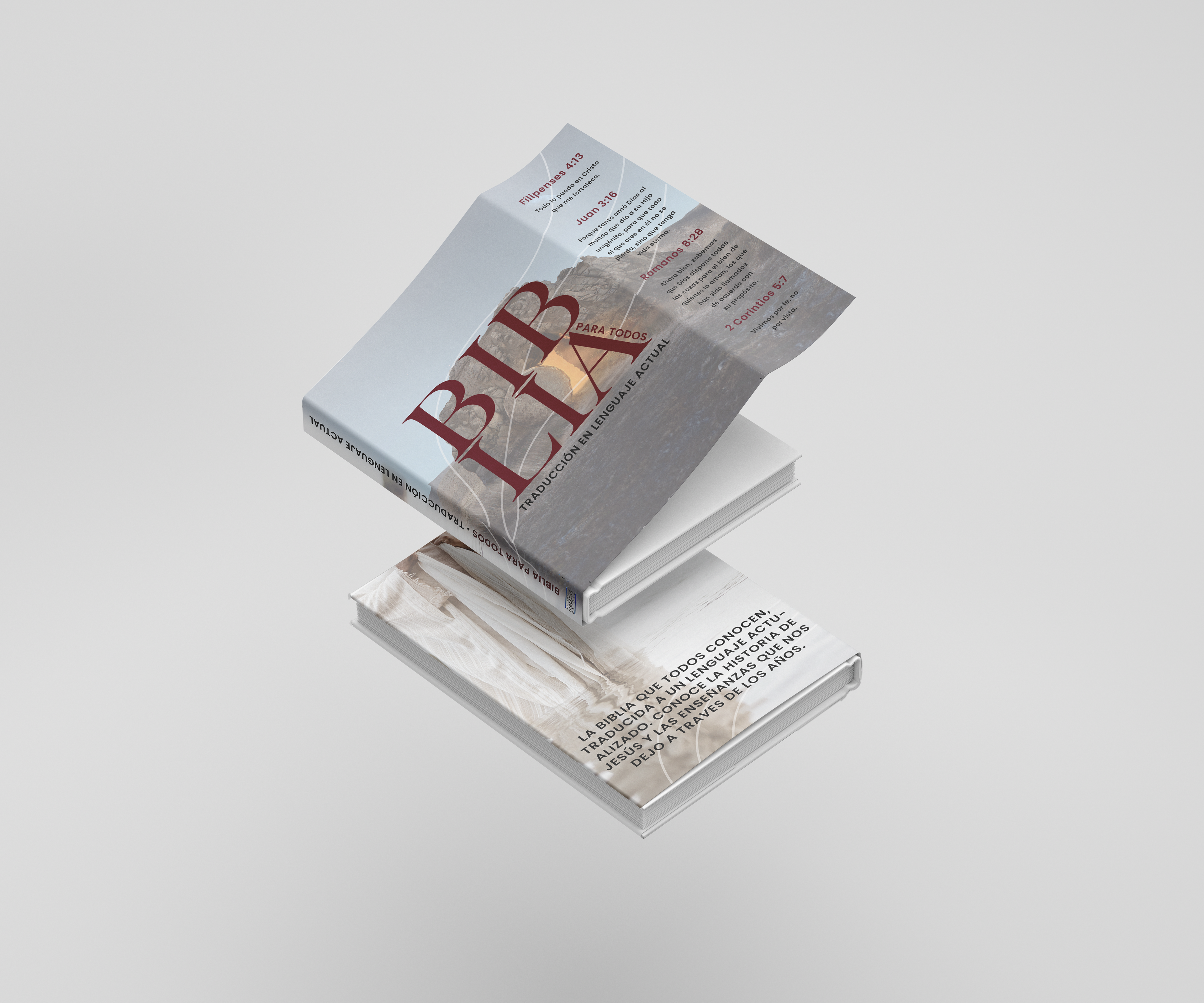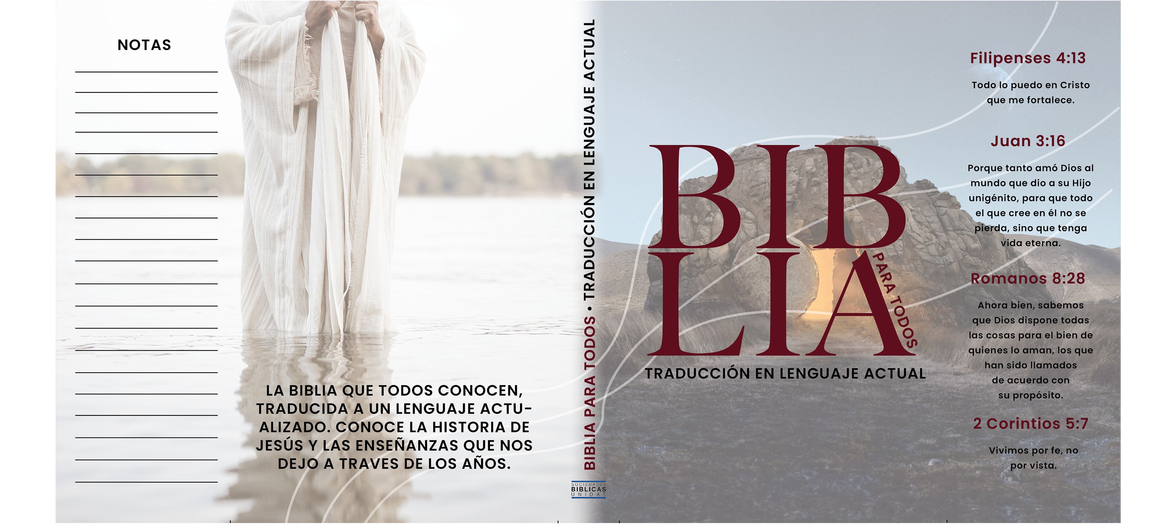 Este “dust cover” fué creado para cubrir una Biblia y poder proteger la misma. La portada se puede ver que es el nombre de este libro: BIBLIA PARA TODOS. En las pestañas del interior, se puede ver que una de ellas esta compuesta de algunos versículos bíbilicos y la otra esta compuesta de lineas pensadas para que puedas usarlas para tomar notas.